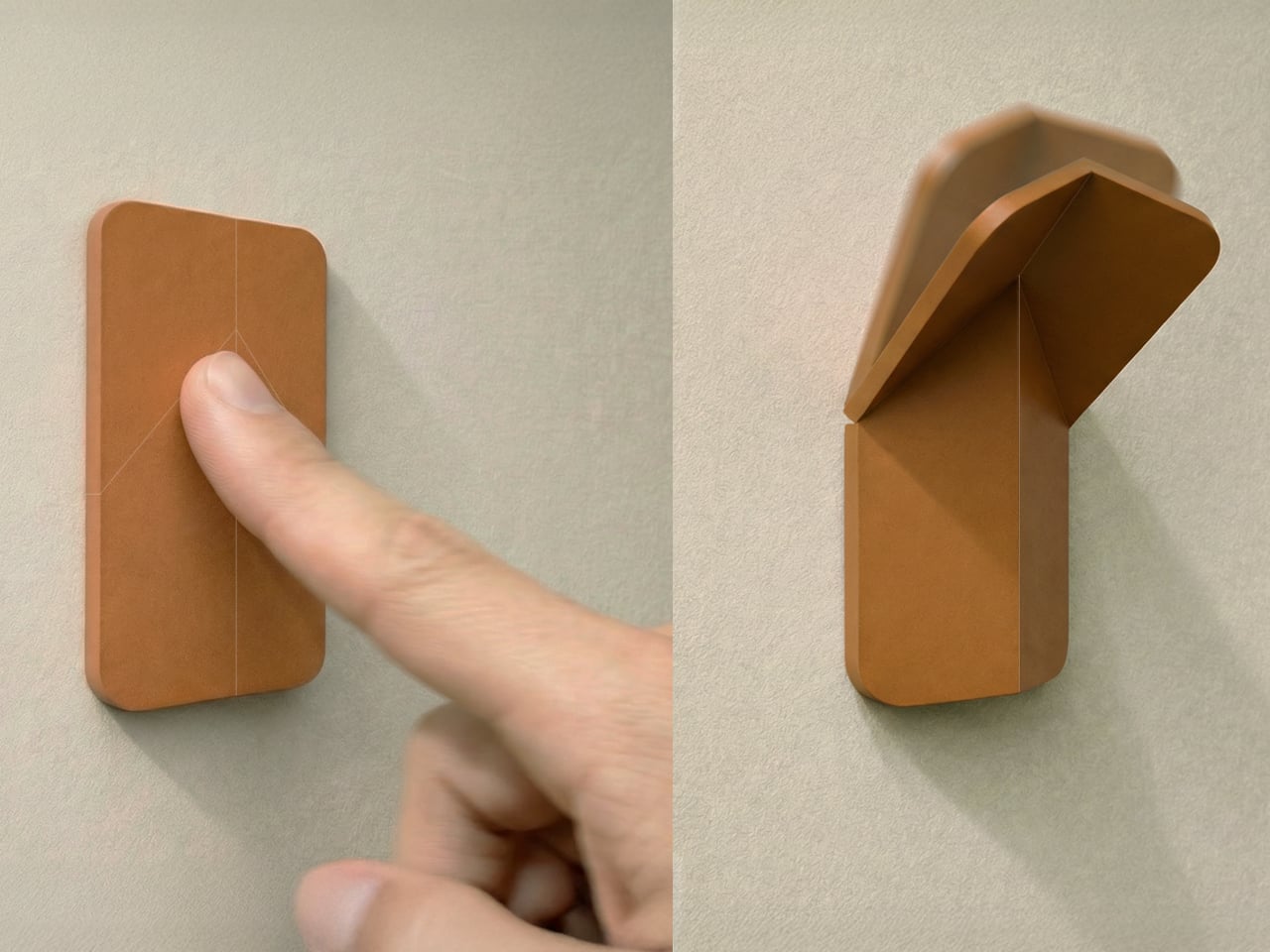 The transformation happens with a single push. A spring-assisted mechanism lets the flat panel unfold into a hook that holds coats, bags, or scarves without extra effort. The movement is inspired by origami, turning a flat surface into a functional volume through precise folds. The interaction becomes a small, deliberate gesture every time you come home or leave, pressing the panel and watching it quietly fold out to catch your jacket.